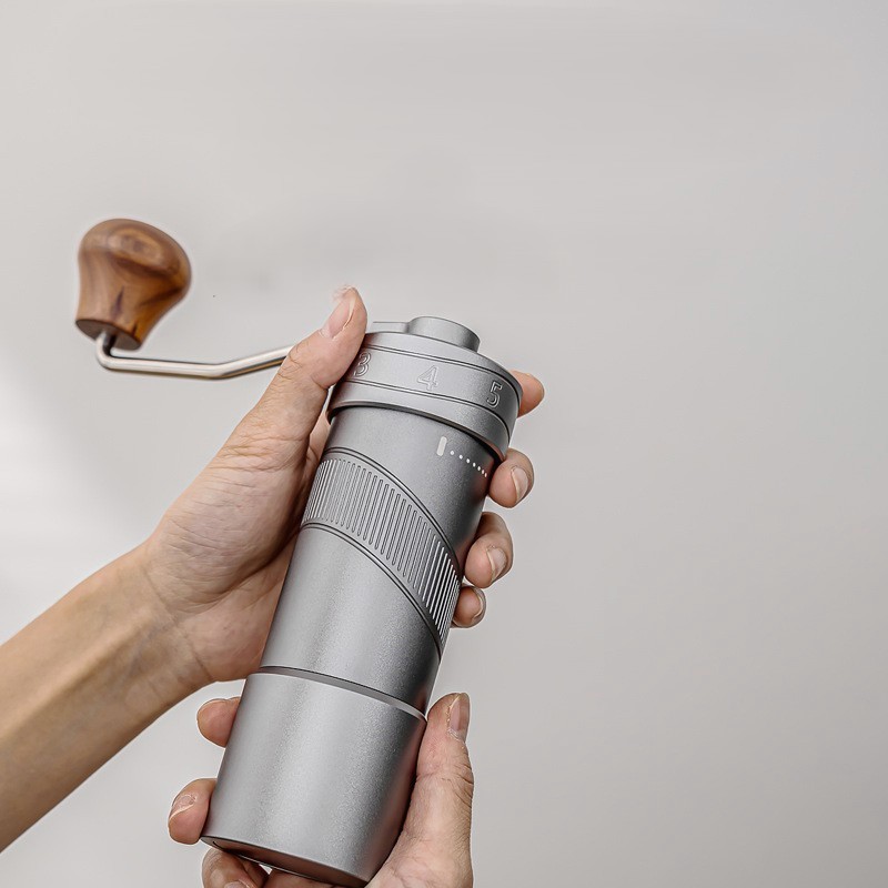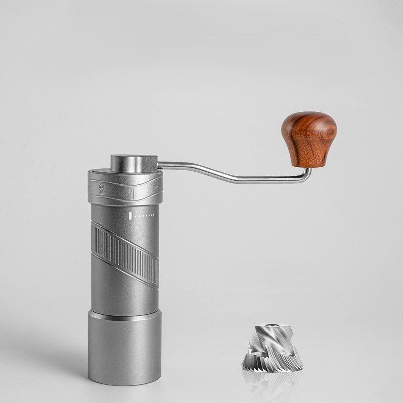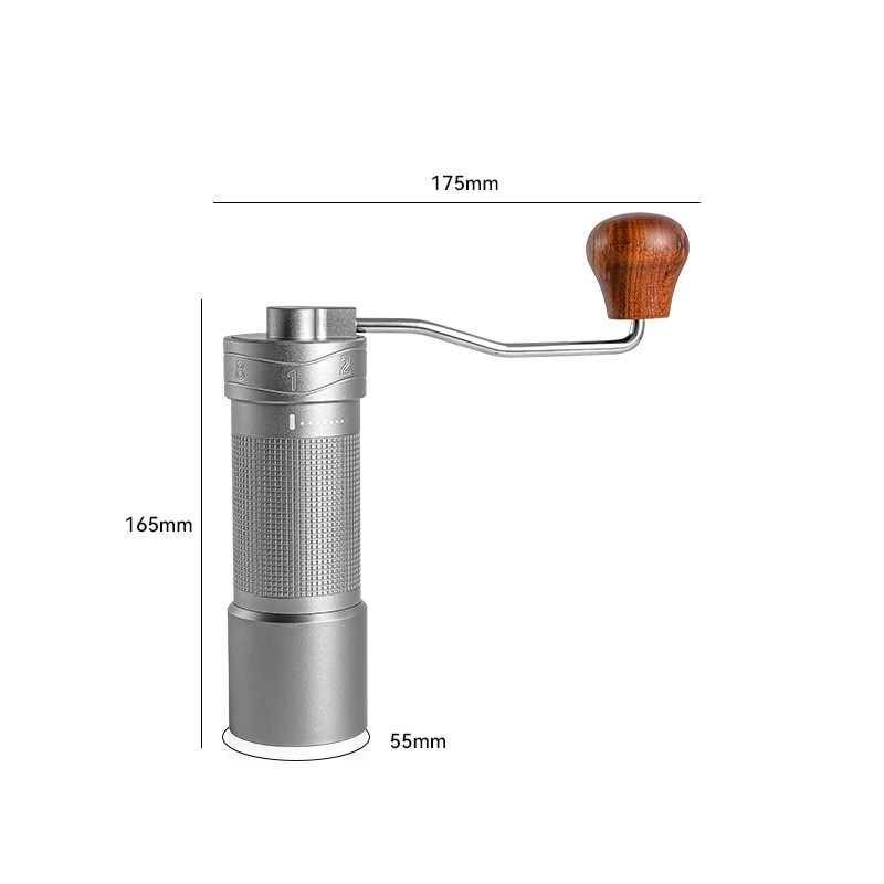 Manuelle Kaffeemühle aus Edelstahl mit externer Mahlgradeinstellung. Verfügt über ein Gehäuse aus 304-Stahl, einen gerändelten Schaft für festen Halt und eine ergonomische Holzkurbel. Kompakt (Ø55×165 mm) und tragbar, liefert es gleichmäßiges Mahlgut von extrafein bis grob für Espresso, Pourover, Frenchpress und mehr. Ideal für Zuhause, Büro oder Reisen.