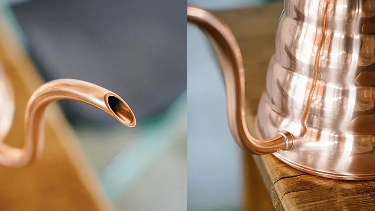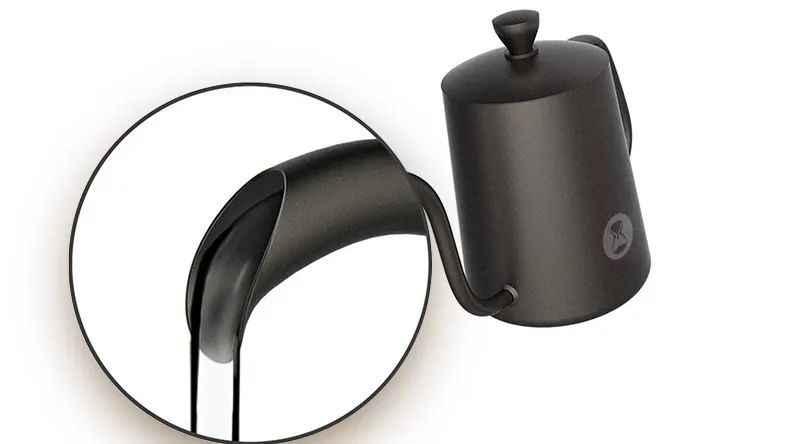 Zweitens gibt es Flachauslauftragbare Kaffeekannen, deren Öffnungen tendenziell parallel zur horizontalen Ebene verlaufen. Ohne das Umleitungsdesign des Auslaufs ist es wahrscheinlicher, dass das ausströmende Wasser eine parabolische Kurve bildet, was mehr Übung erfordert, um frei verwendet zu werden.